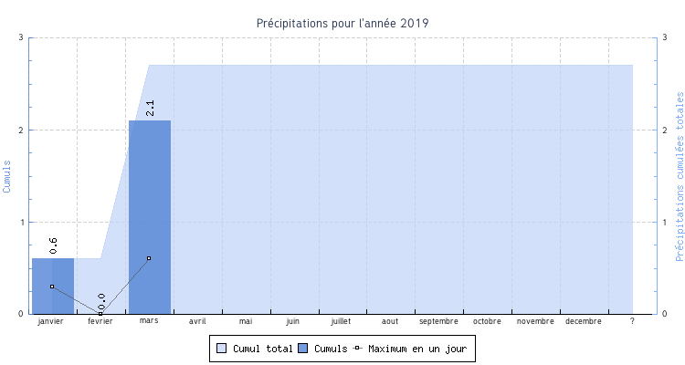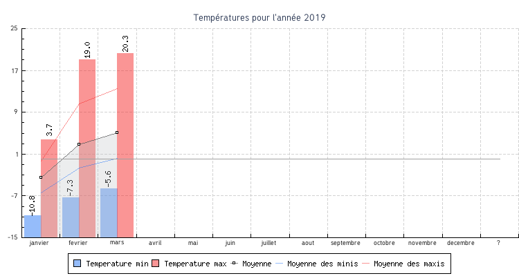 | fevrier | -7.3 °C | -1.7 °C | 19.0 °C | 10.6 °C | 2.8 °C | 0.0 km/h | 0.0 km/h | 90 |